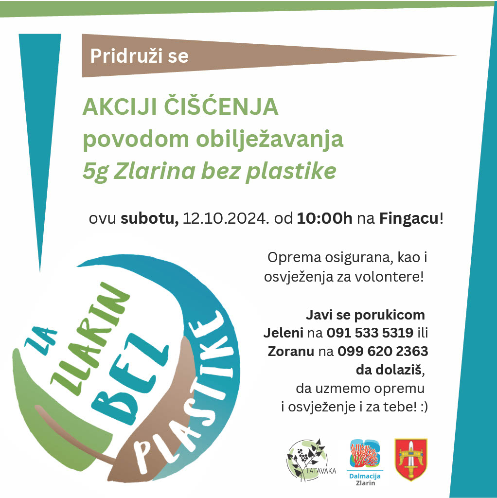 Pozivamo Vas sve u subotu 12.10.2024. od 10:00 h na Fingacu da zajedno obilježimo 5 godina Zlarina bez plastike.