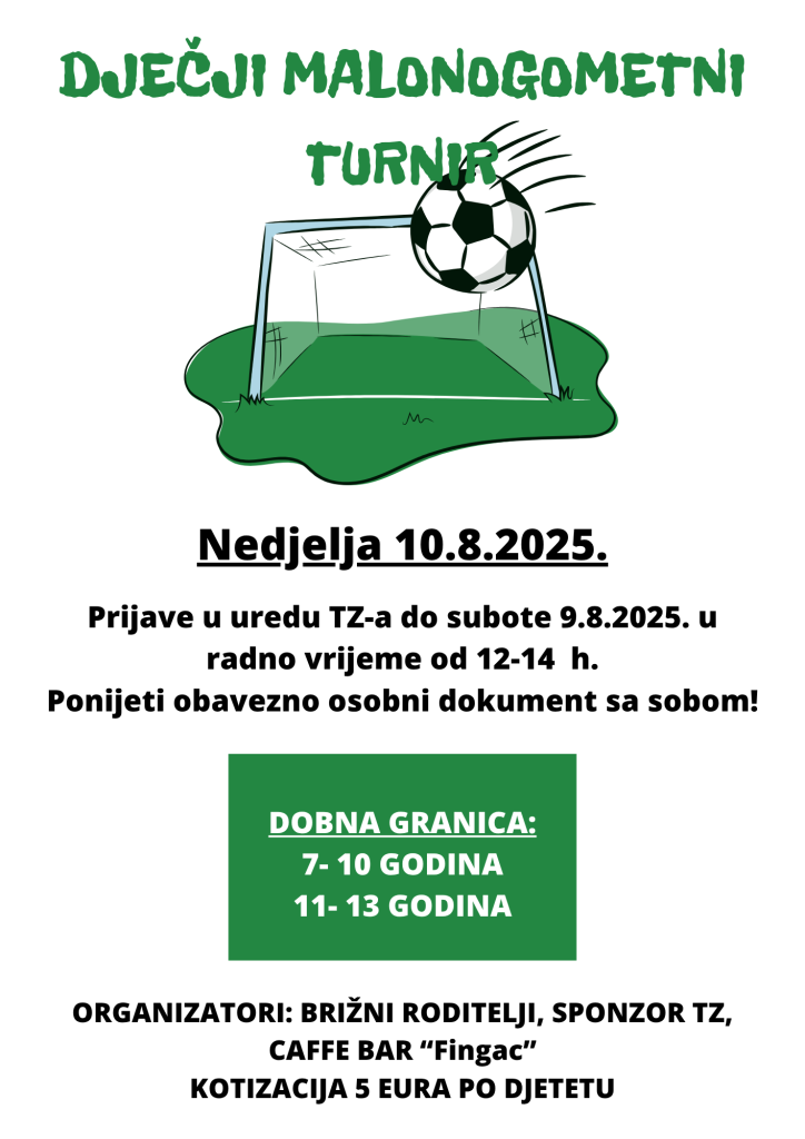 Pozivamo svu djecu na dječji malonogometni turnir koji će se održati u nedjelju 10.8.2025. u 19:00 h na Fingacu.