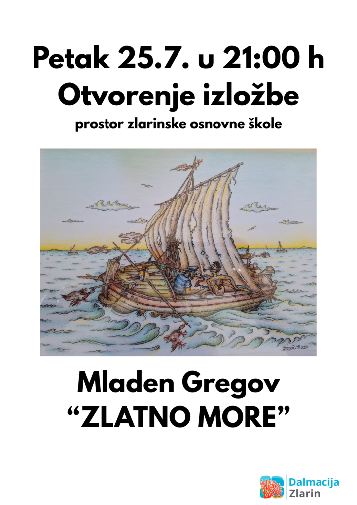 Pozivamo Vas na otvorenje izložbe Zlatno more autora Mladena Gregova u petak 25.7.2025. s početkom u 21:00 h u prostoru osnovne škole na Zlarinu.