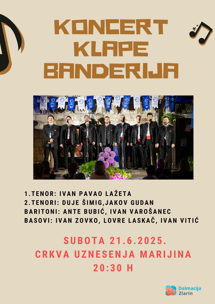 Pozivamo Vas sve na prvi ovoljetni koncert klape Banderija. Subota 21.6.2025. s početkom u 20:30 h u župnoj Crkvi uznesenja Marijina.