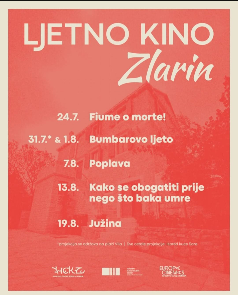 Ljetno kino Zlarin donosi niz besplatnih projekcija za sve uzraste: od dokumentarca Fiume o morte!, Oscarom nagrađenog animiranog filma Poplava, tajlandske senzacije Kako se obogatiti prije nego što baka umre, do crne komedije Južina.