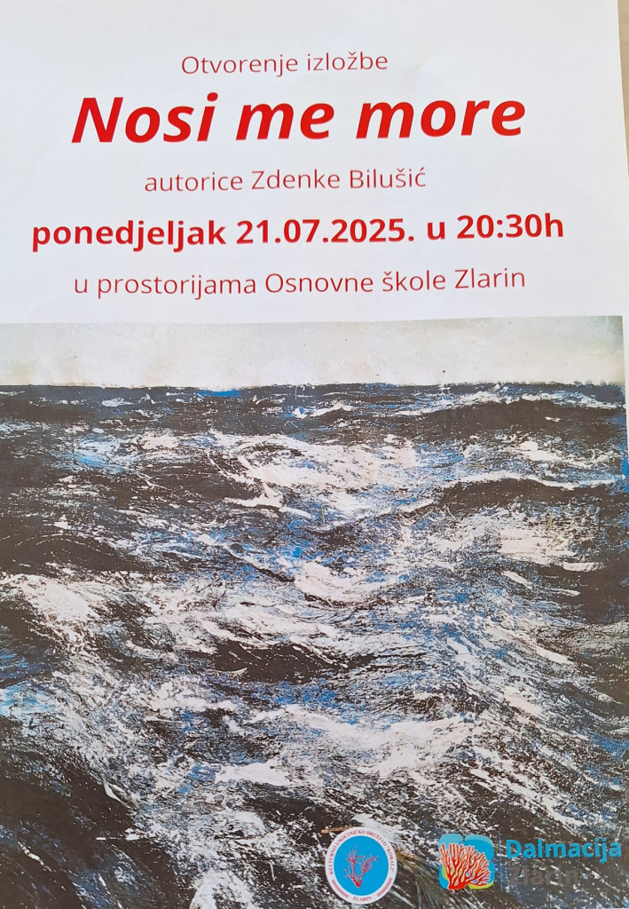 Pozivamo Vas na otvorenje izložbe Nosi me more autorice Zdenke Bilušić u ponedjeljak 21.07.2025. s početkom u 20:30 h u prostorijama zlarinske osnovne škole.