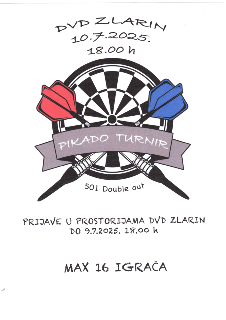 Pozivamo Vas sve da se prijavite na pikado turnir koji će se održati 10.7.2025. u prostorijama Dvd Zlarin s početkom u 18:00 h.