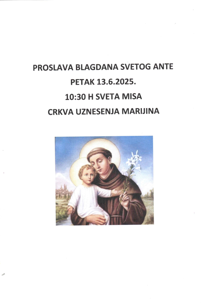Pozivamo Vas na proslavu blagdana svetog Ante u Crkvi Uznesenja Marijina u petak 13.6.2025. na otoku Zlarinu.