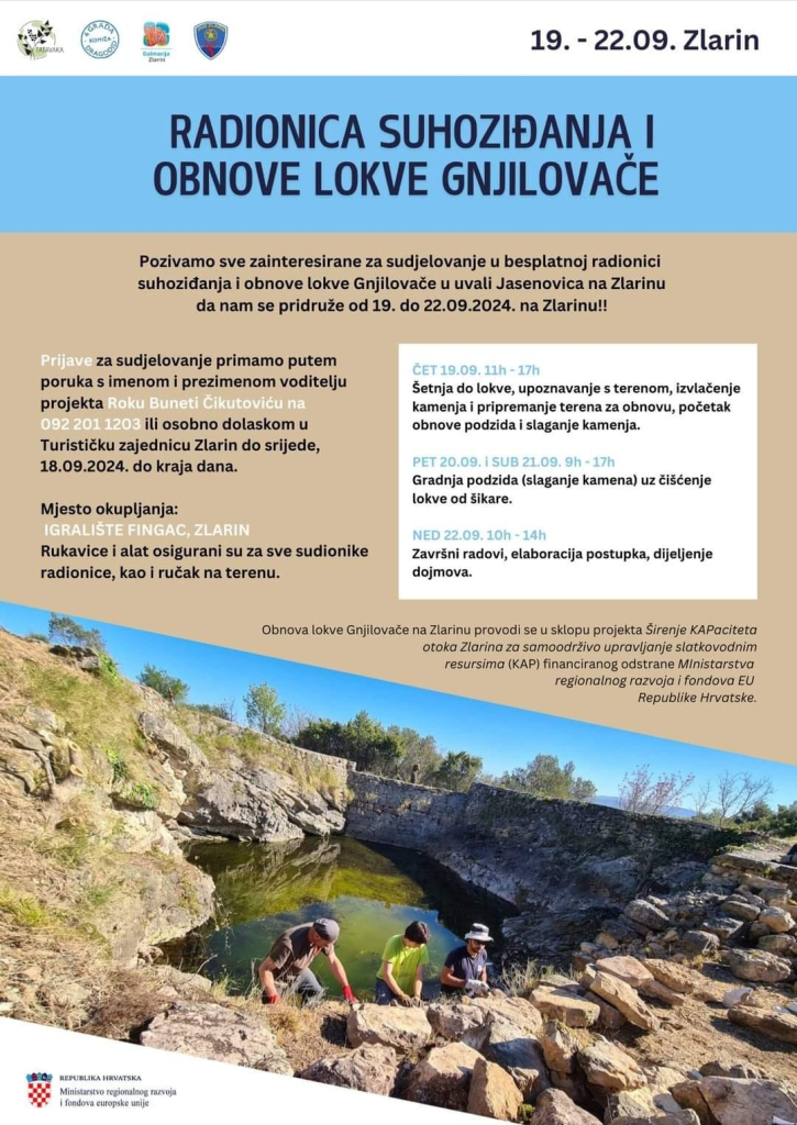 Pozivamo sve zainteresirane za sudjelovanje u besplatnoj radionici suhoziđanja i obnove lokve Gnjilovače u uvali Jasenovica na Zlarinu da nam se pridruže od 19.do 22.9.2024.