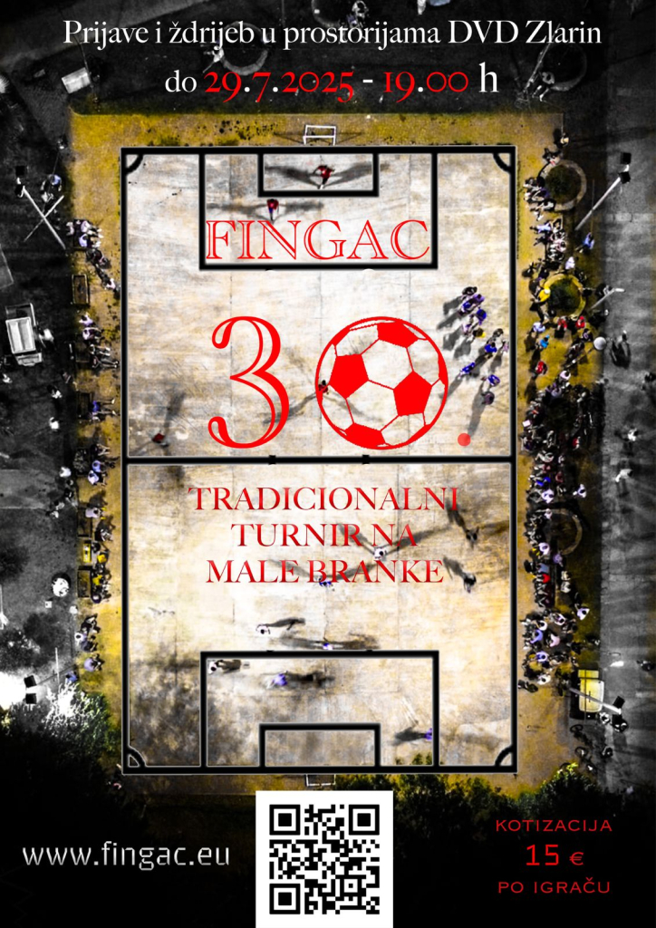 Pozivamo ekipe da se prijave na 30. tradicionalni turnir na male branke koji će početi u srijedu 30.7.2025. na Fingacu. Prijave i ždrijeb u prostorijama Dvd Zlarin do 29.7.2025. do 19:00 h.