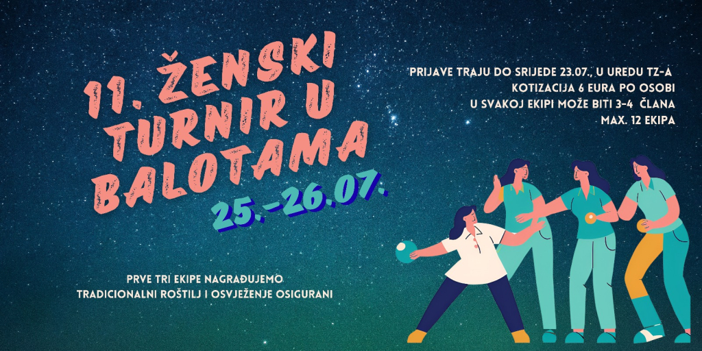 Pozivamo Vas da se prijavite na 11. po redu ženski turnir u balotama koji će se održati 25.7 i 26.7. Prijave u našem uredu do srijede 23.7.